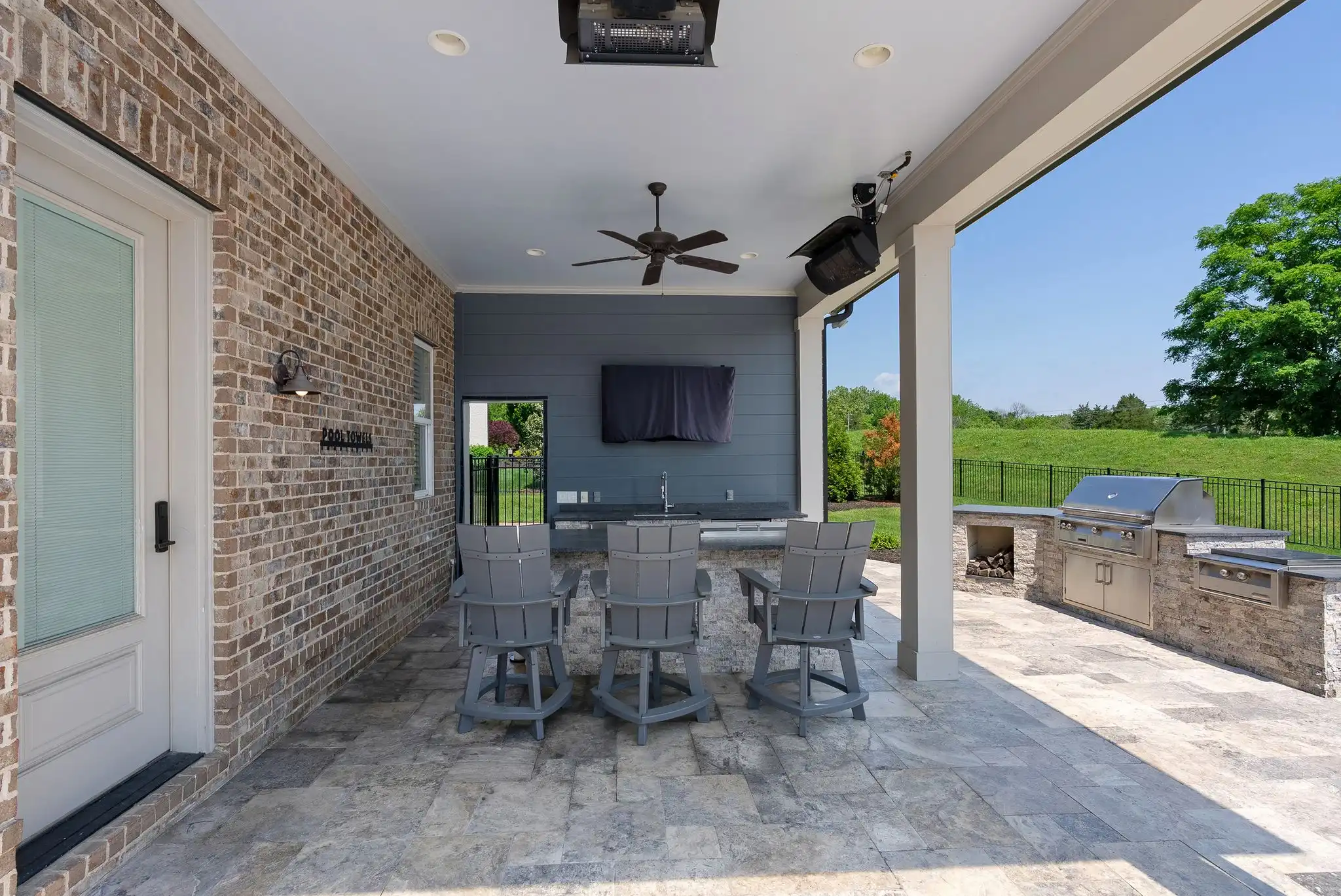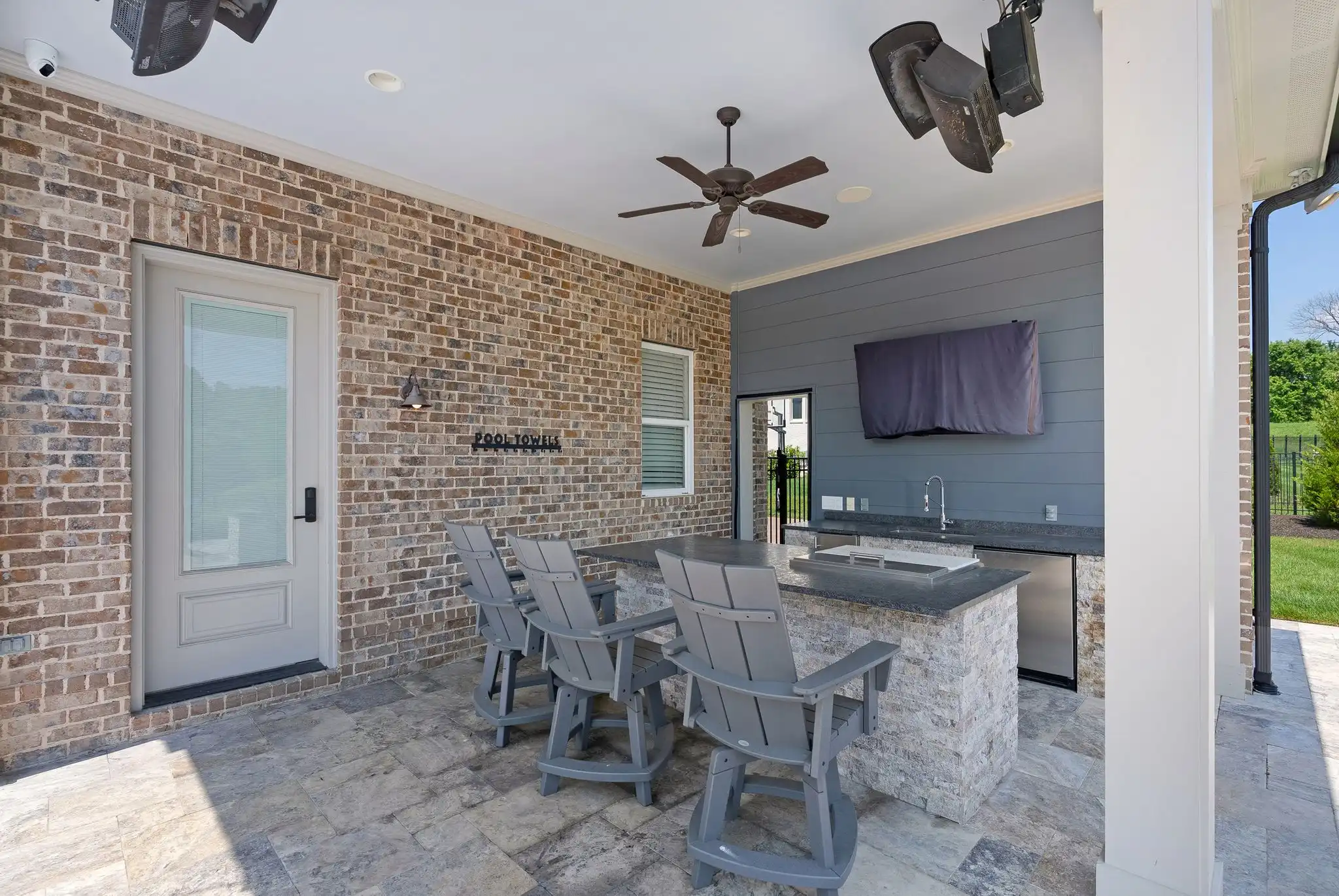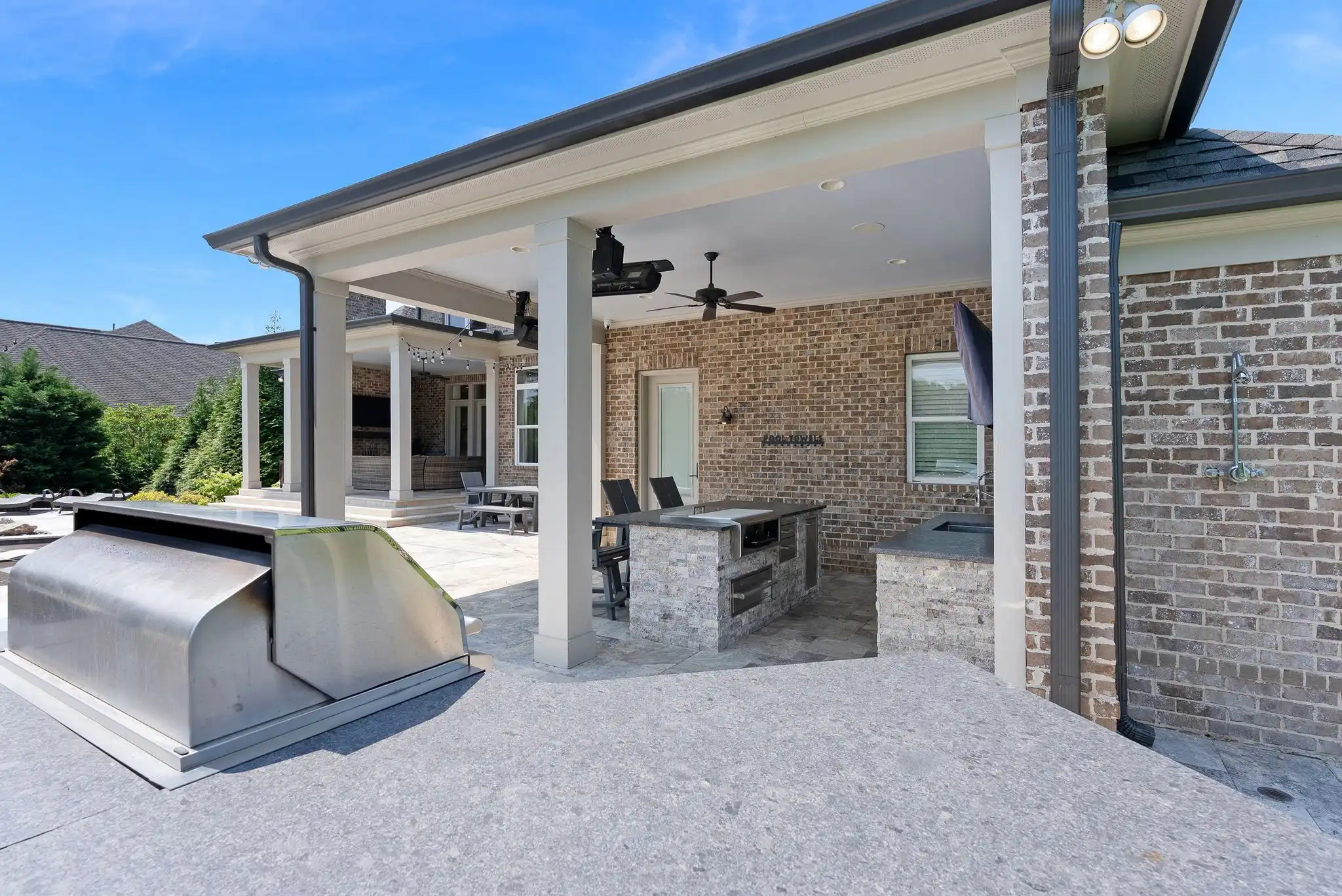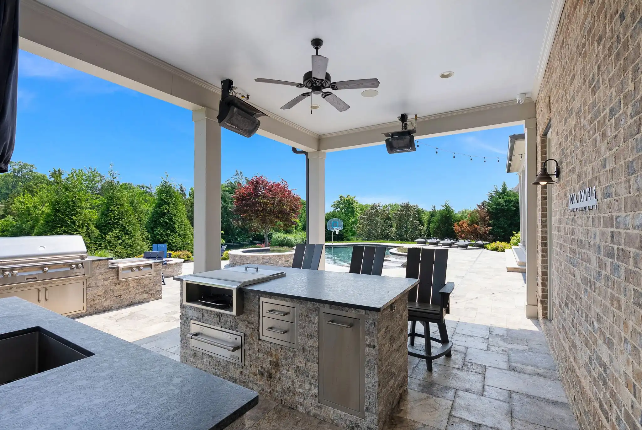 Outdoors, the covered porch with gas fireplace overlooks the pool and spa, while the outdoor kitchen, poolside half bath, and outdoor shower create a perfect setting for entertaining or unwinding. The fully fenced yard, mature landscaping, and access to open green space make this home a true sanctuary—both private and community-connected.