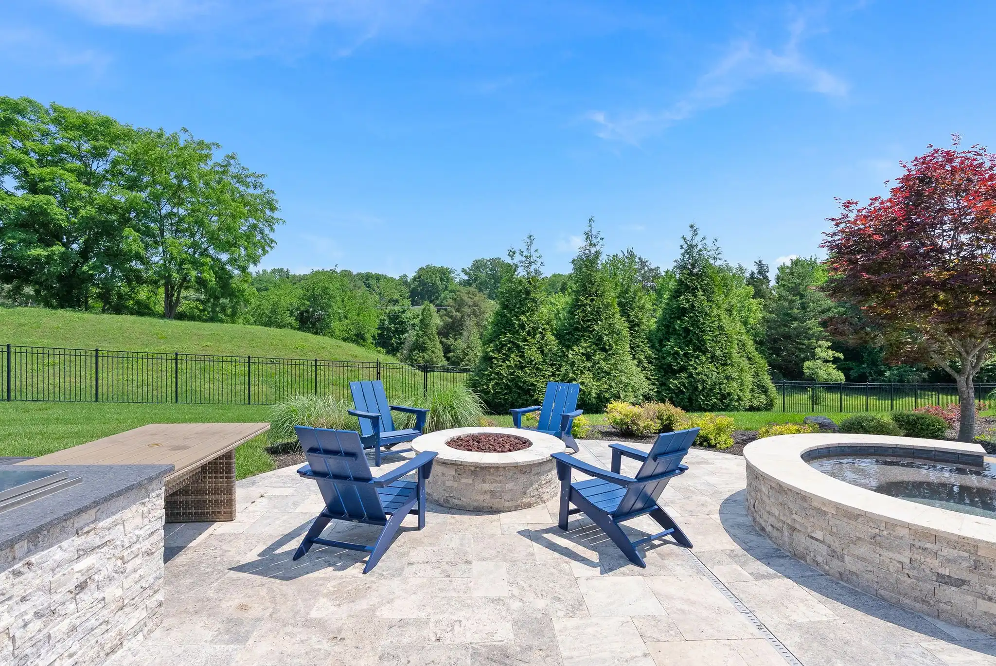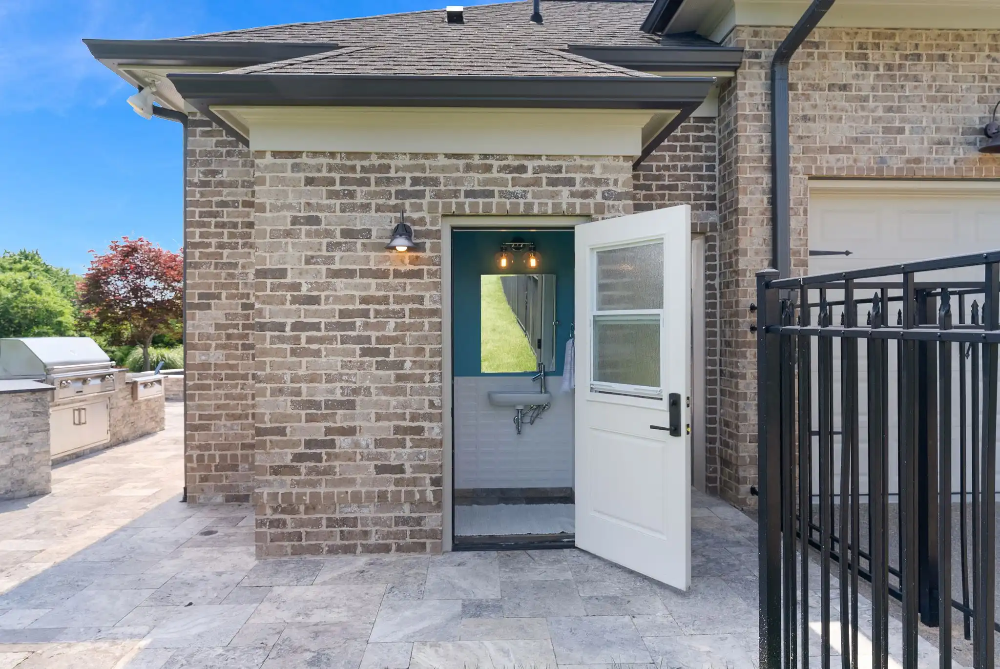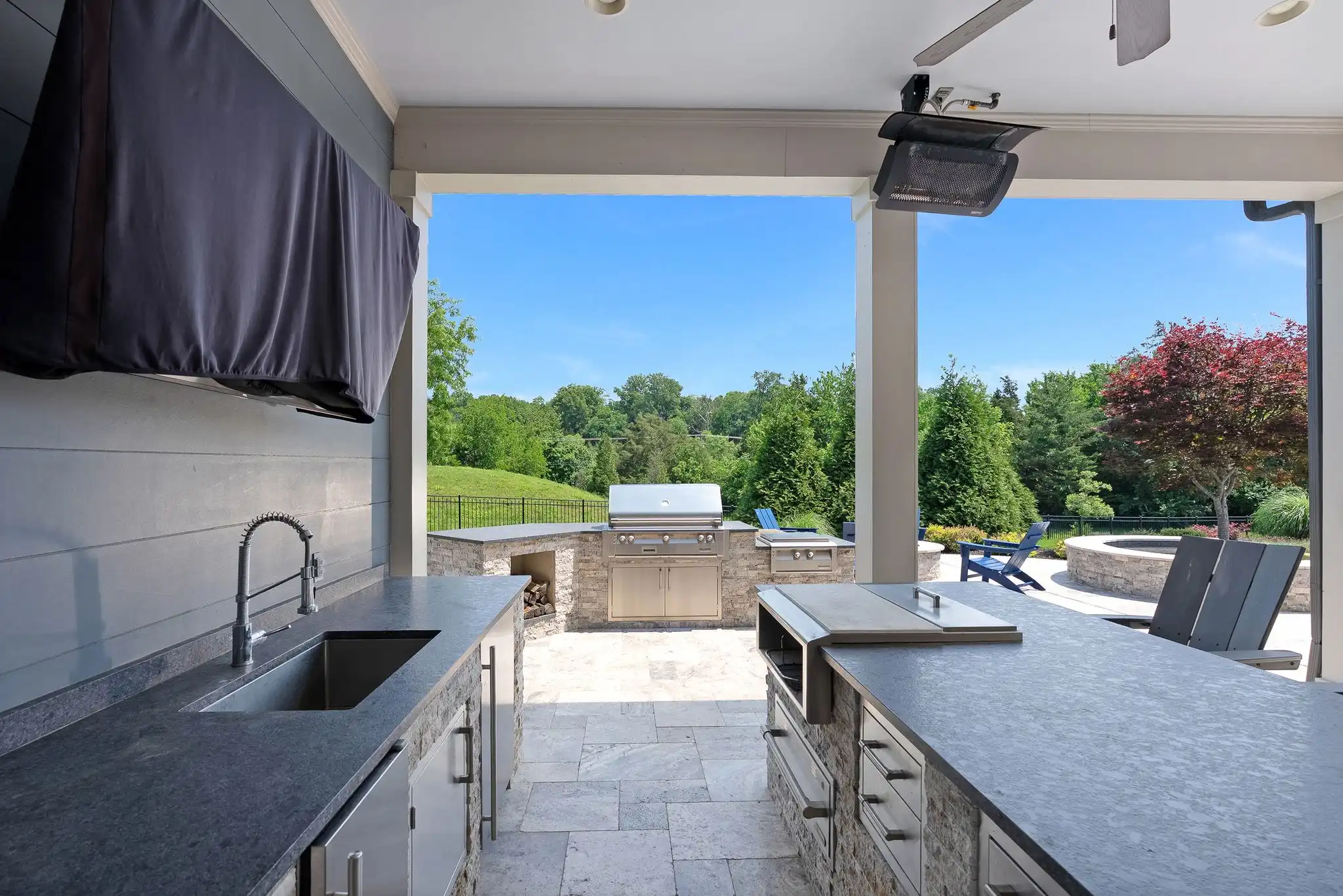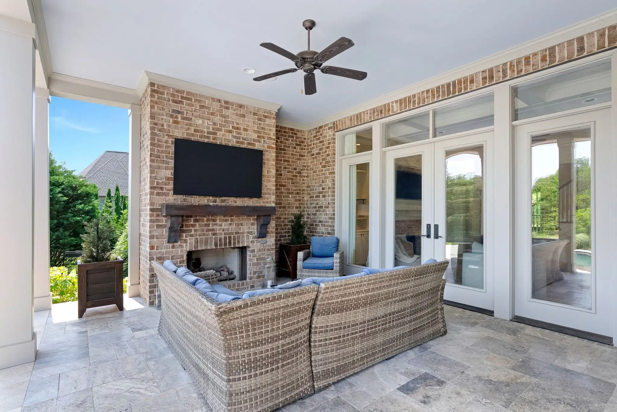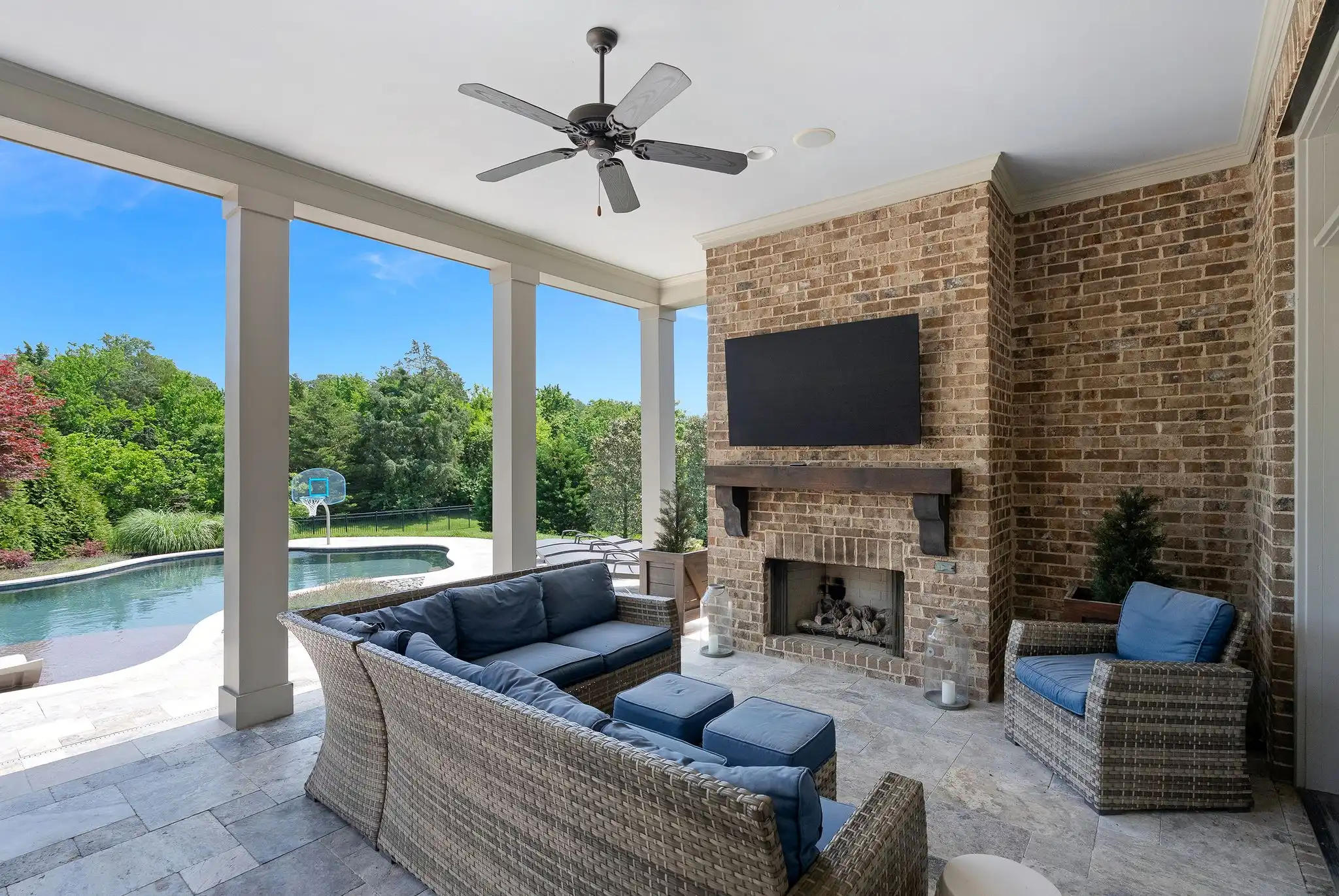 Outdoors, the covered porch with gas fireplace overlooks the pool and spa, while the outdoor kitchen, poolside half bath, and outdoor shower create a perfect setting for entertaining or unwinding. The fully fenced yard, mature landscaping, and access to open green space make this home a true sanctuary—both private and community-connected.