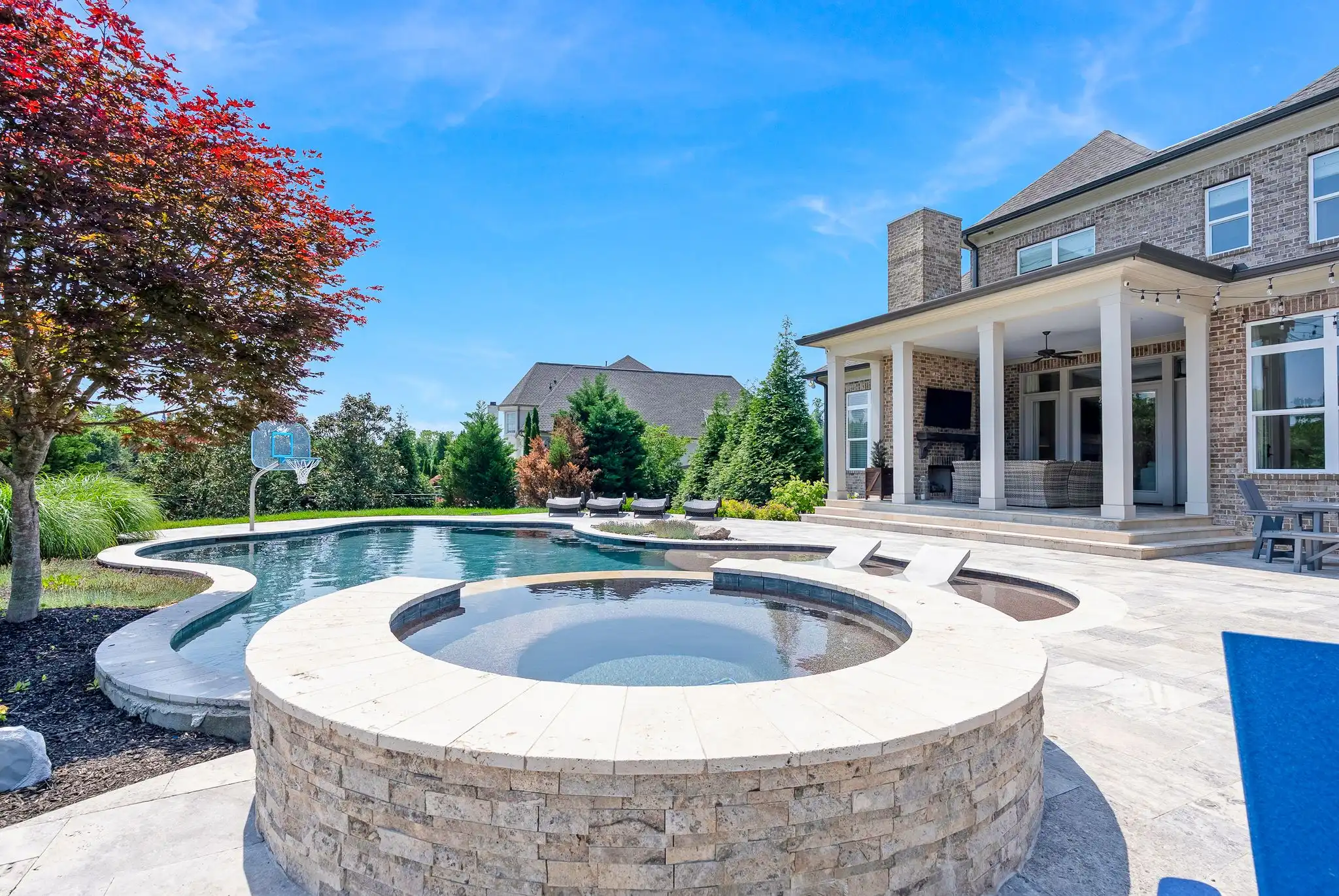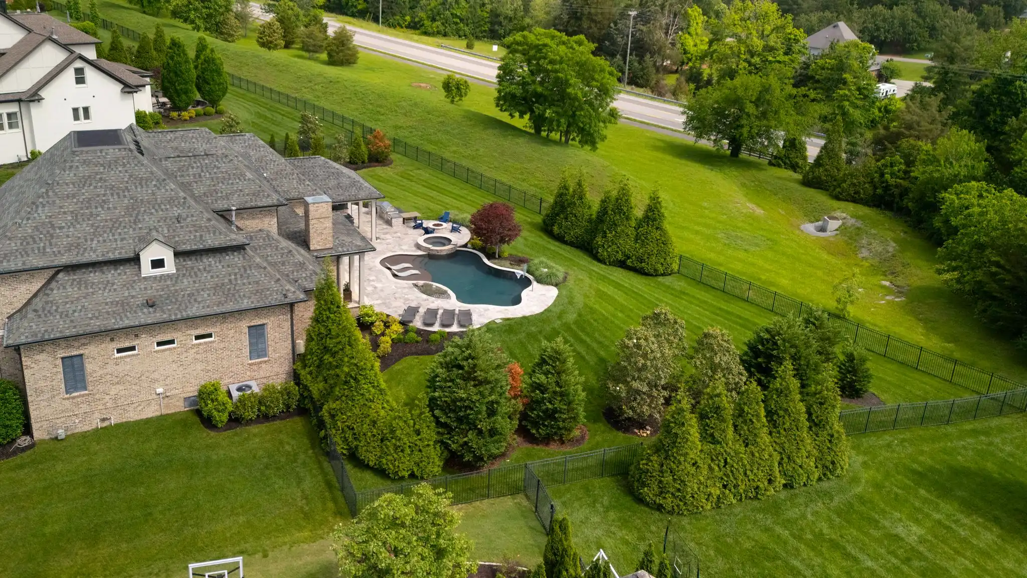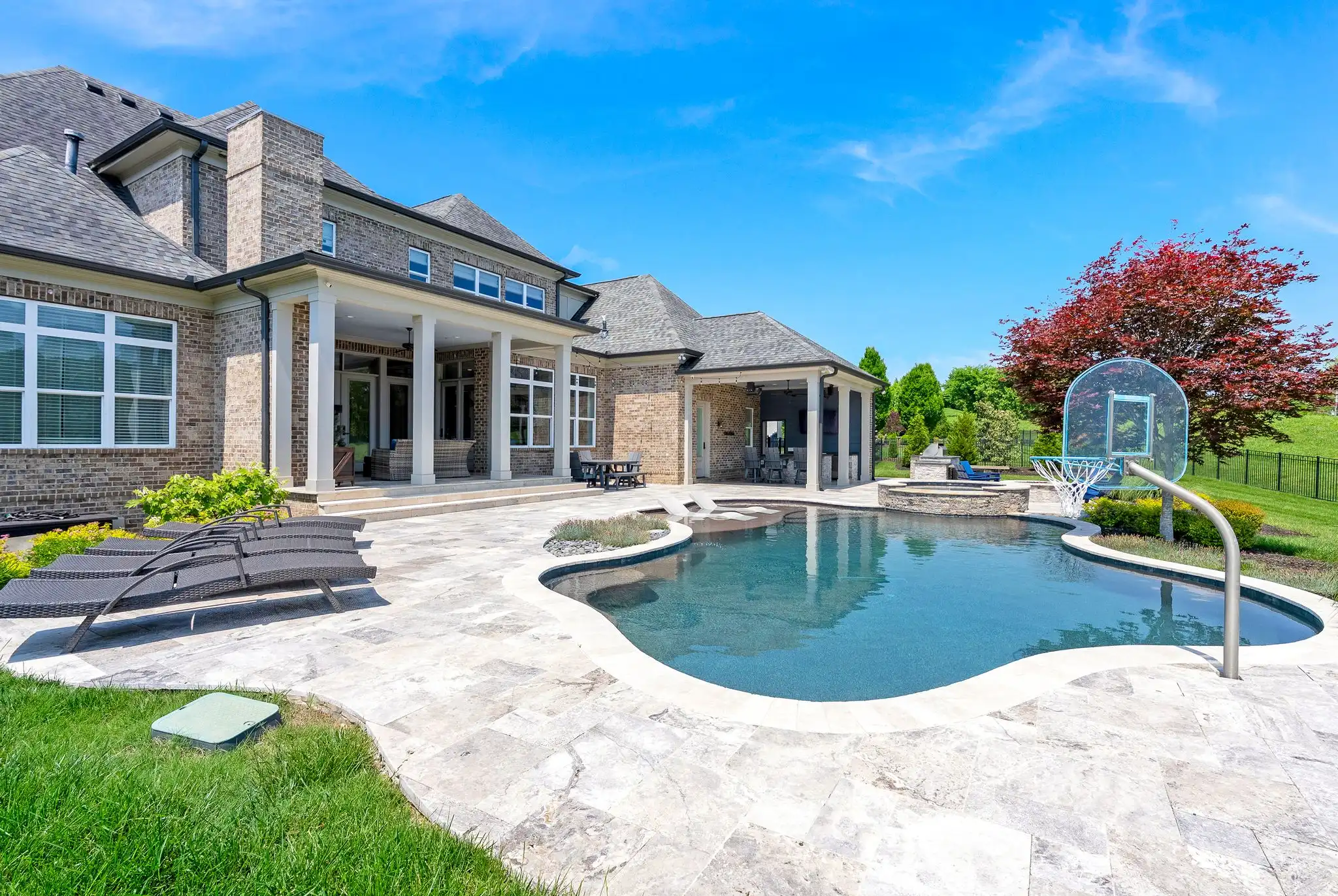 A long, flat driveway leads to a spacious three-car garage complete with a basketball hoop, while a large front yard welcomes you home with impressive presence and charm. Even with a resort-style pool and spa, the backyard remains expansive—featuring lush green space, a generous side yard, and direct access to the community’s open common area, ideal for hosting impromptu football or baseball games with friends and family.