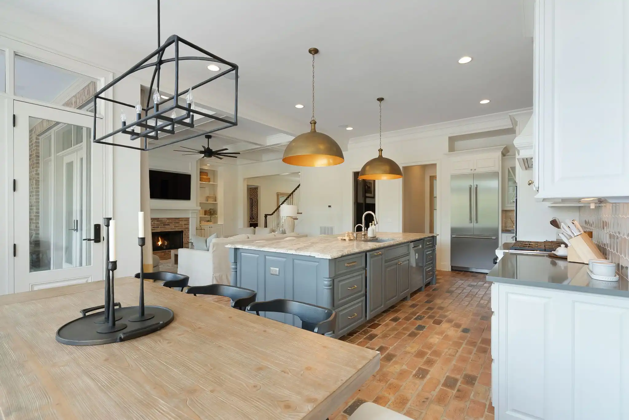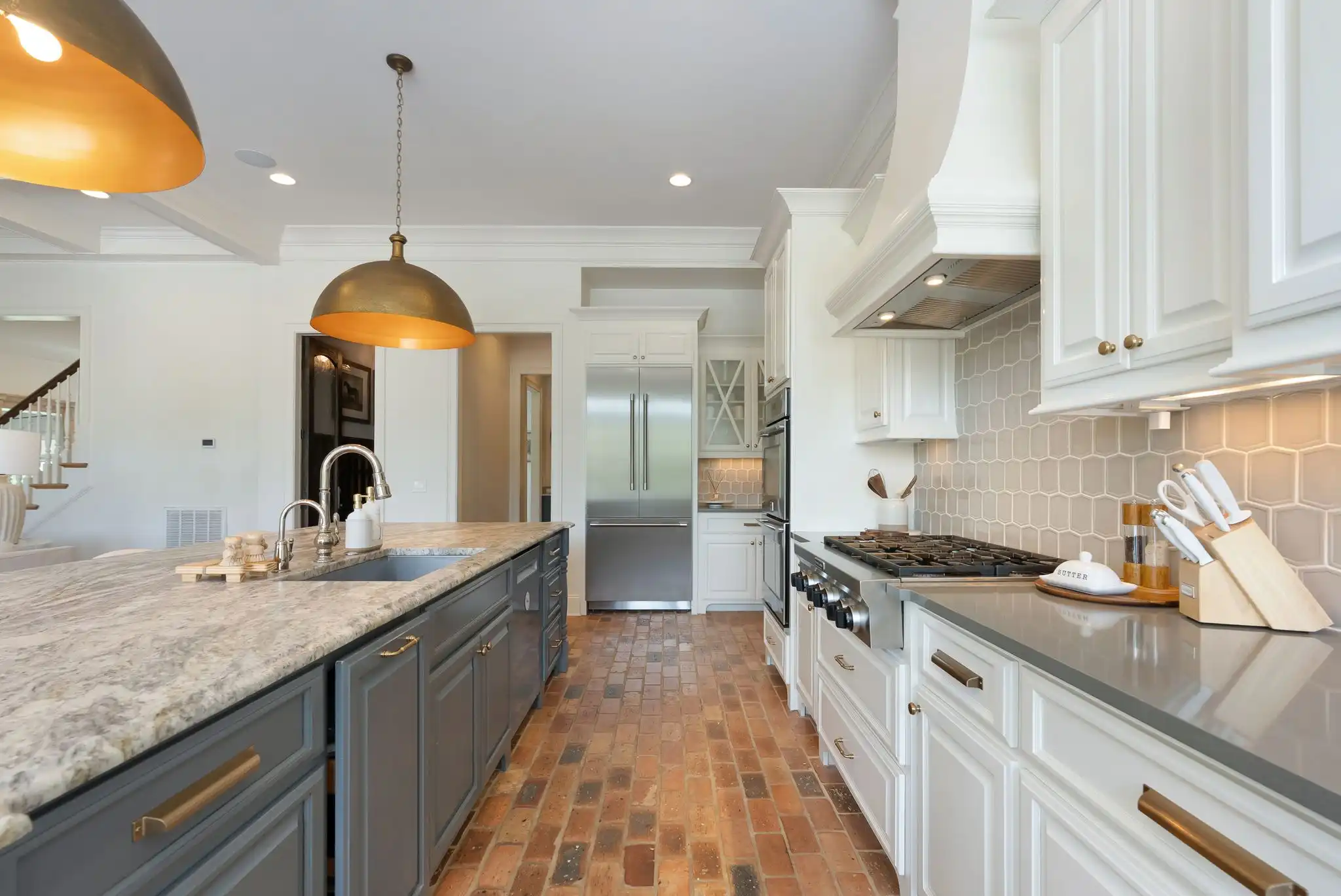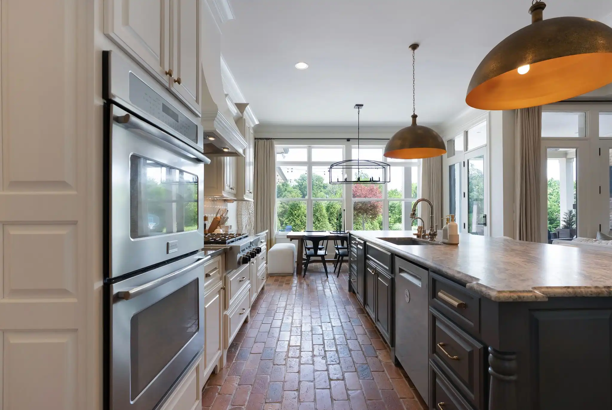 The kitchen is a true centerpiece—crafted for the entertainer or home chef alike—featuring double ovens, a six-burner gas range, oversized island, butler’s pantry, and a temperature-controlled 463-bottle wine cellar. Living and dining areas flow effortlessly, bathed in natural light and timeless character.