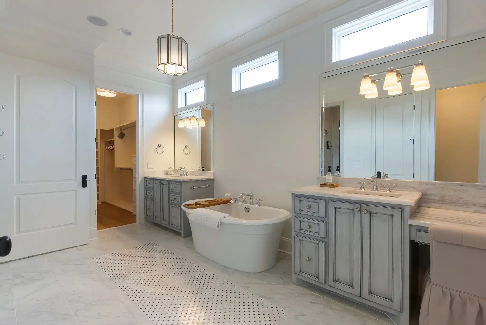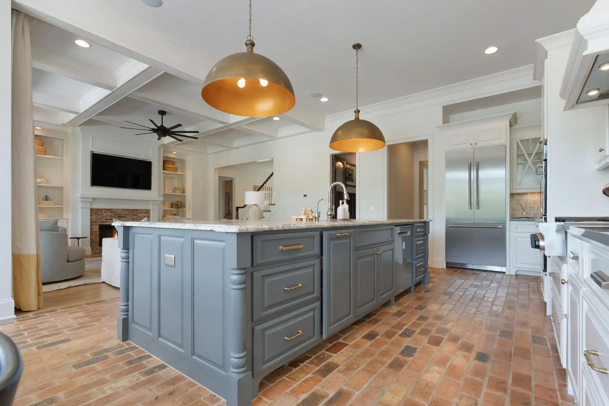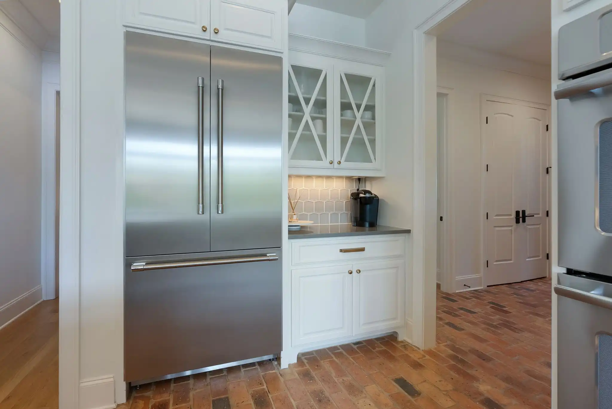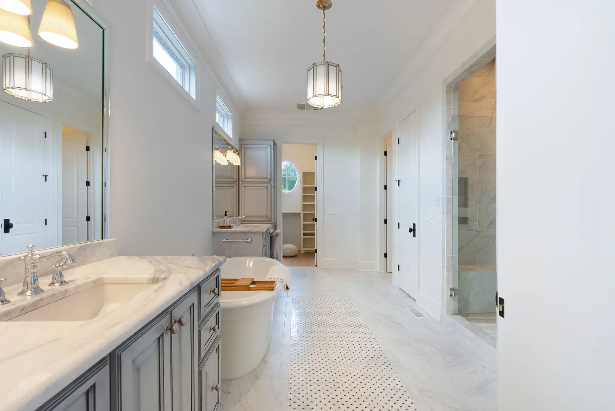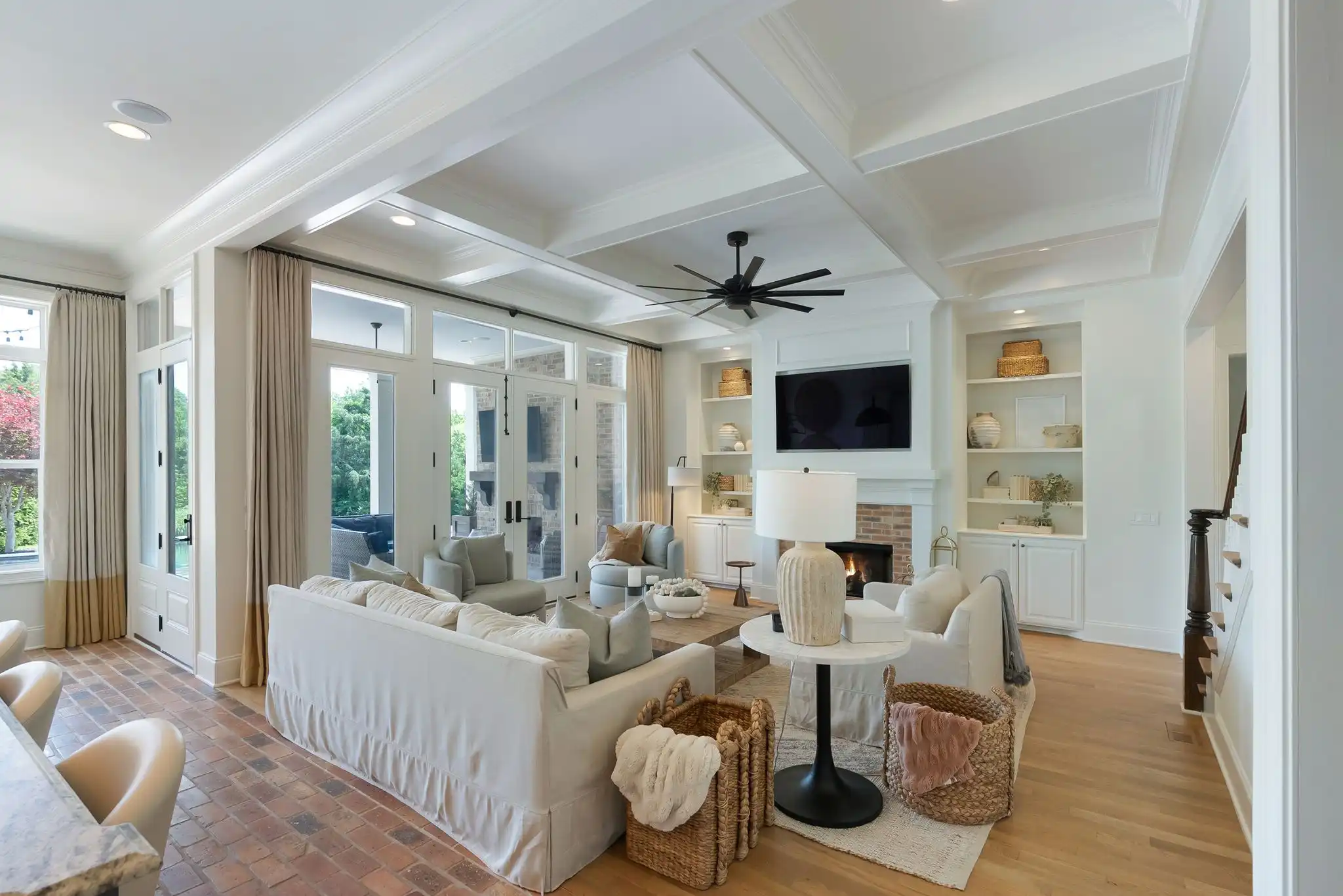 Inside, refined finishes abound, from reclaimed Chicago brick flooring and solid core doors to coffered ceilings and refinished hardwoods throughout the main level. With two bedrooms on the main floor, including a spacious primary suite, the layout offers both comfort and function. The primary retreat features his-and-her walk-in closets, dual vanities, and a serene, spa-inspired bath.