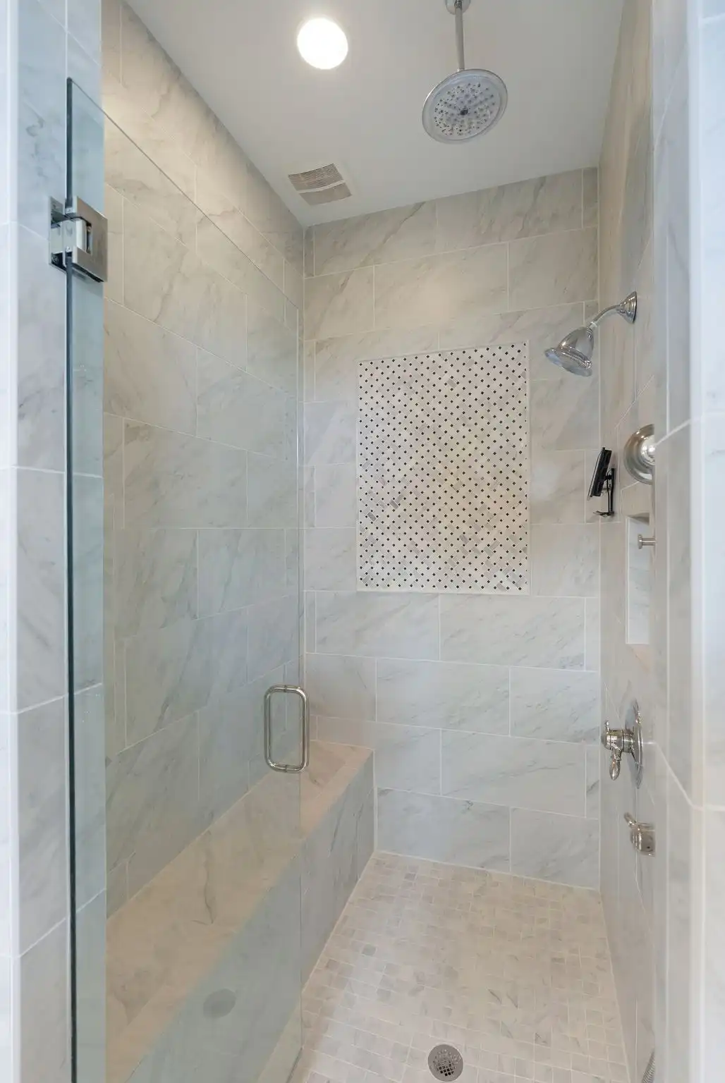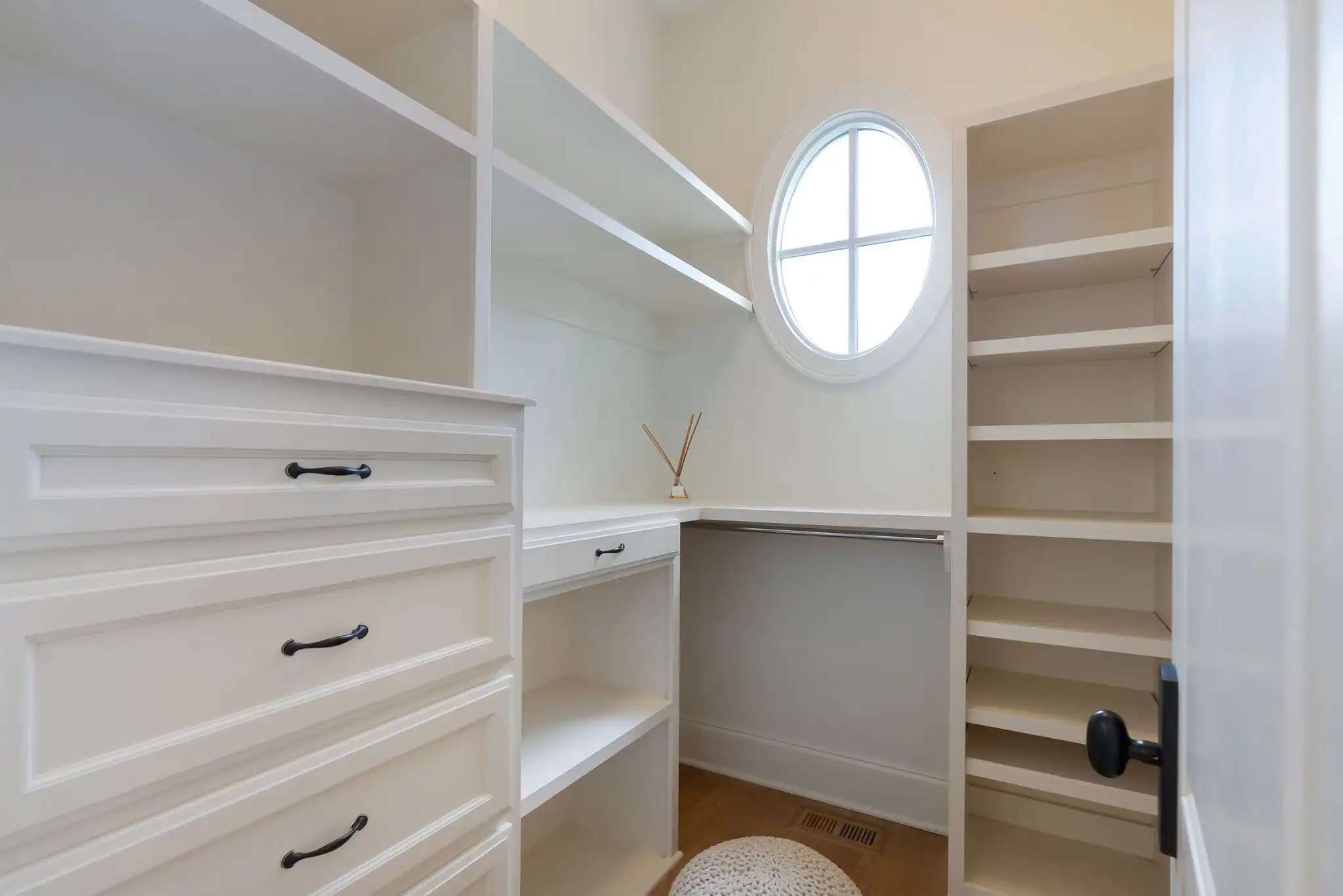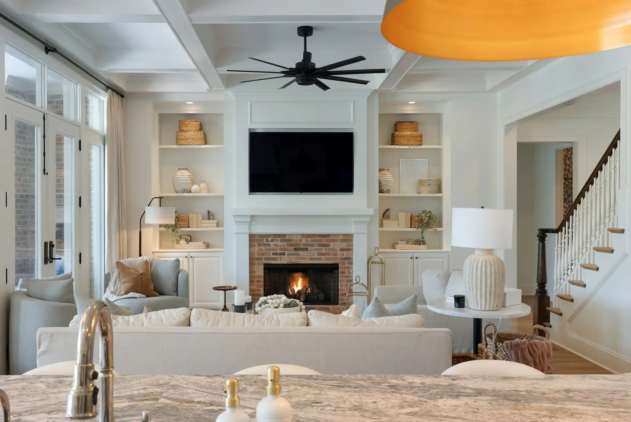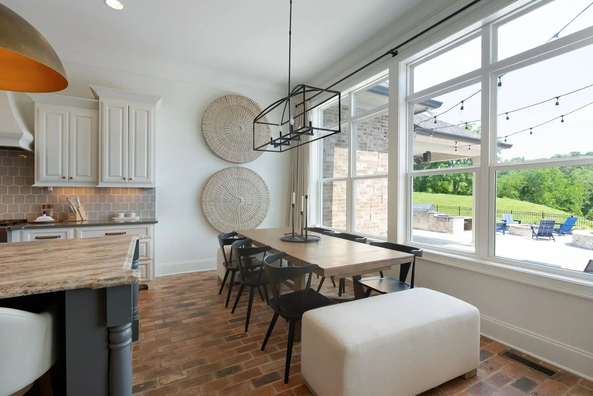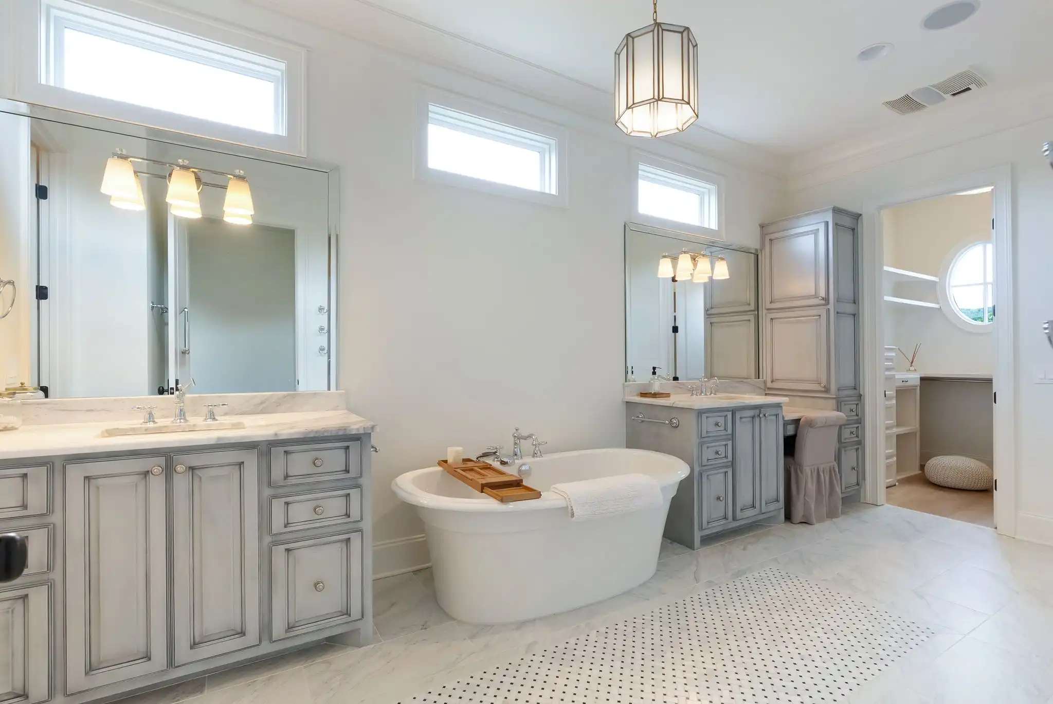 Inside, refined finishes abound, from reclaimed Chicago brick flooring and solid core doors to coffered ceilings and refinished hardwoods throughout the main level. With two bedrooms on the main floor, including a spacious primary suite, the layout offers both comfort and function. The primary retreat features his-and-her walk-in closets, dual vanities, and a serene, spa-inspired bath.