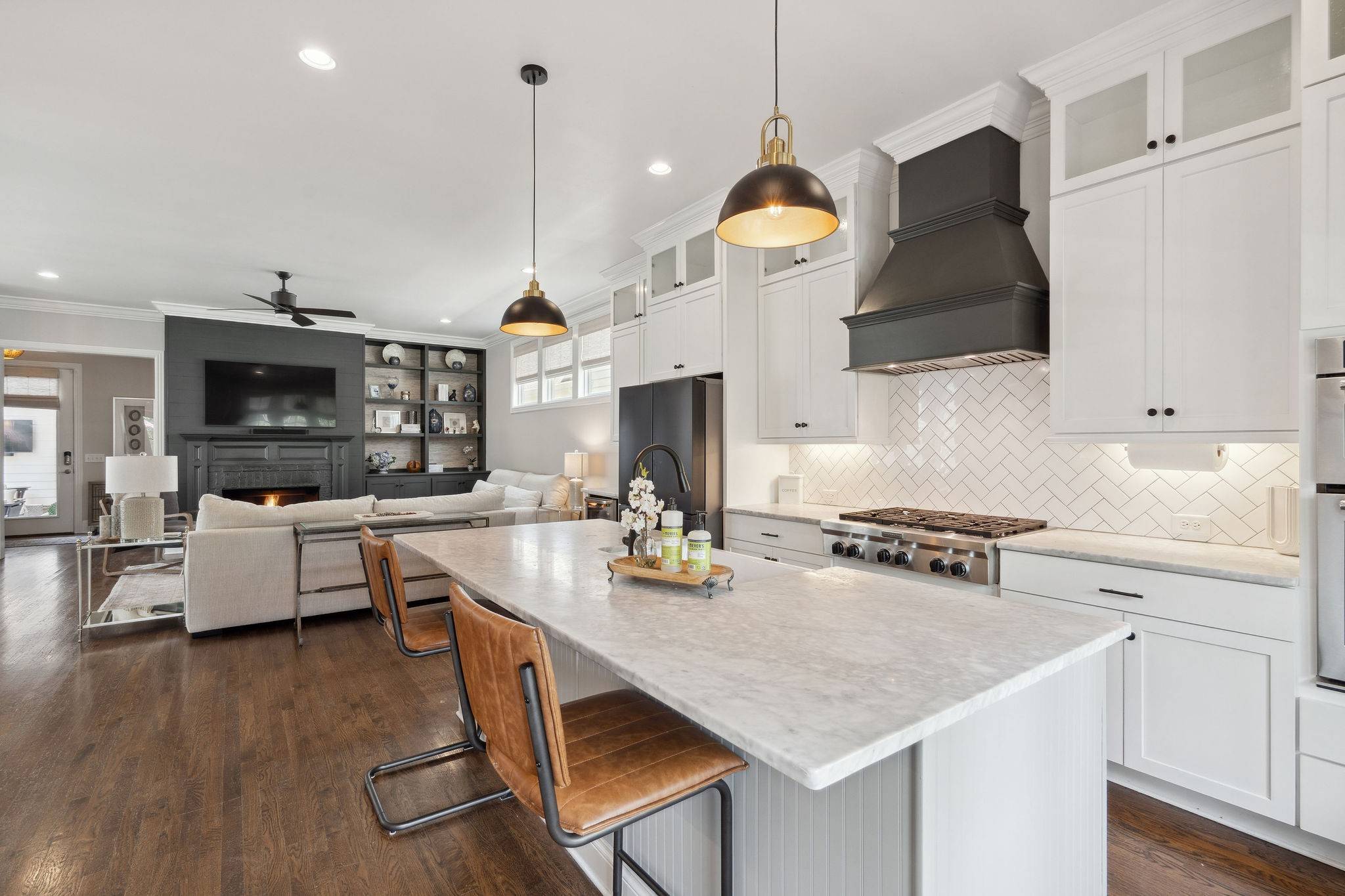 Featuring 4 bedrooms and 3.5 baths, with a main-level primary suite, this home boasts hardwood floors throughout, marble countertops, custom lighting, shiplap accents, and built-in bookcases. The kitchen is thoughtfully placed at the front of the home while large front and back covered porches extend your living space outdoors. The back deck is perfect for entertaining with a stylish pergola, and the rare 3-car garage offers abundant storage and functionality.